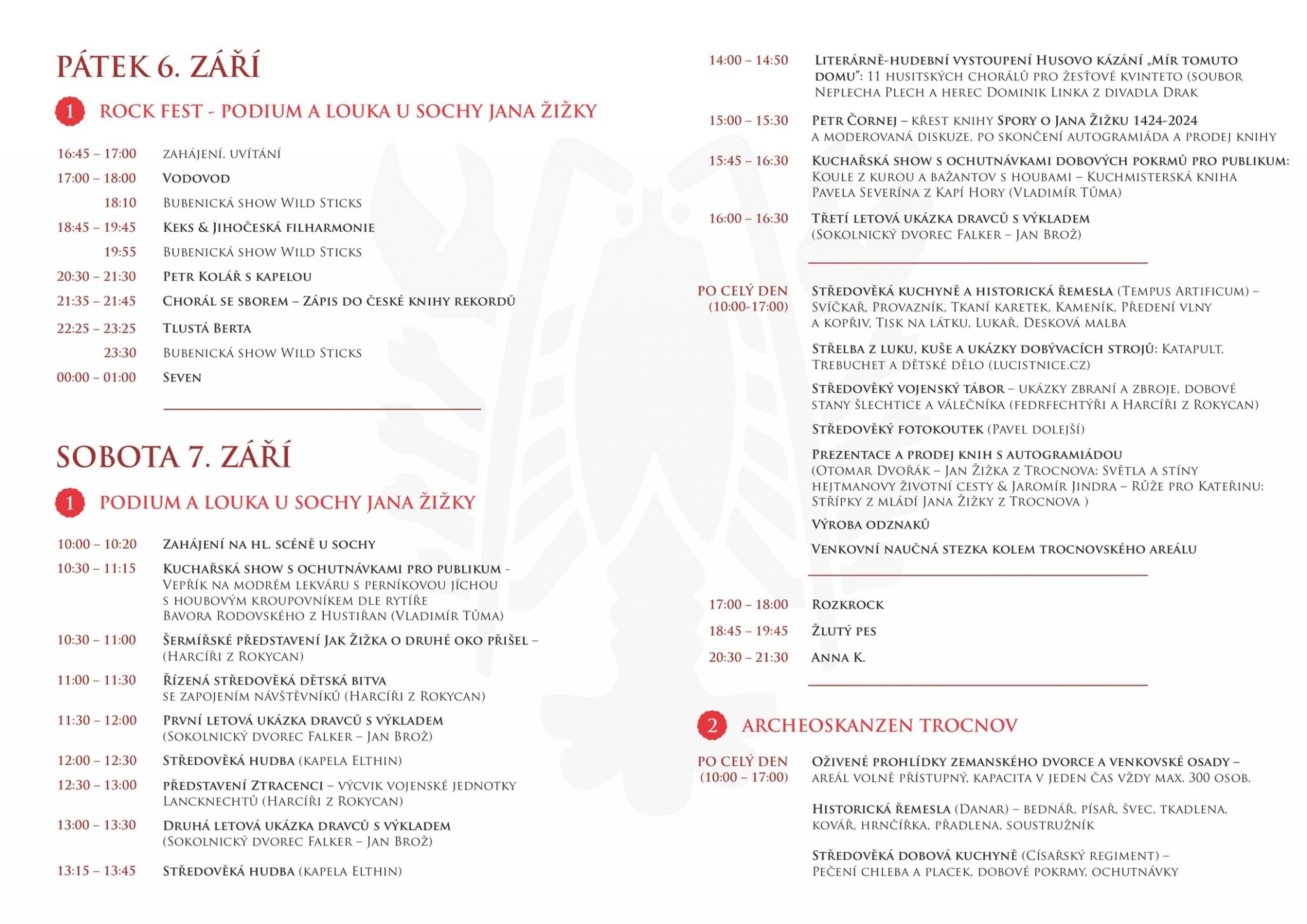 Kromě hudebních vystoupení, bude probíhat bohatý program pro děti i dospělé v pátek odpoledne, večer i celou sobotu, otevřen bude také nový Archeoskanzen v areálu Památníku Jana Žižky z Trocnova.