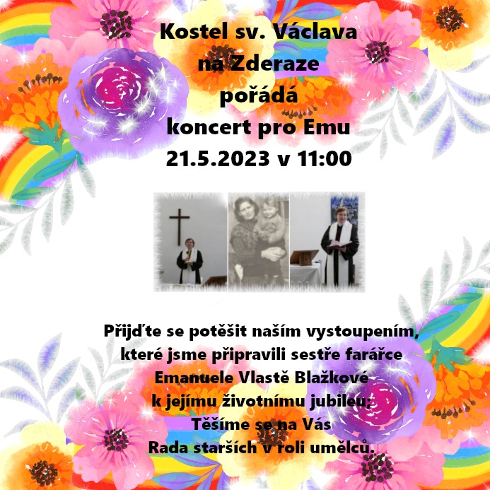 21.5.2023 od 11 hodin. Zveme všechny, kteří znají sestru farářku Emanuelu Blažkovou na "Koncert pro Emu" při příležitosti jejich významných narozenin.