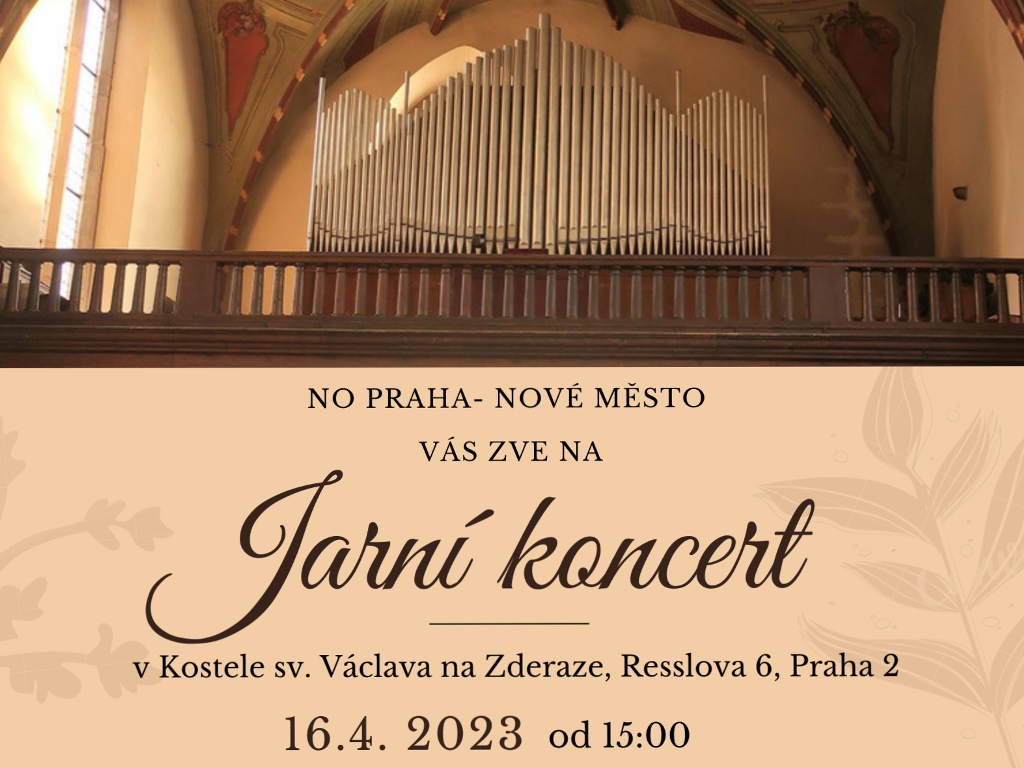 NO Praha - Nové město vás srdečně zve na Jarní koncert v kostele sv. Václava na Zderaze, Resslova 6, Praha 2. Vstupné dobrovolné. Výtěžek ze vstupného bude využit na chystanou opravu varhan.