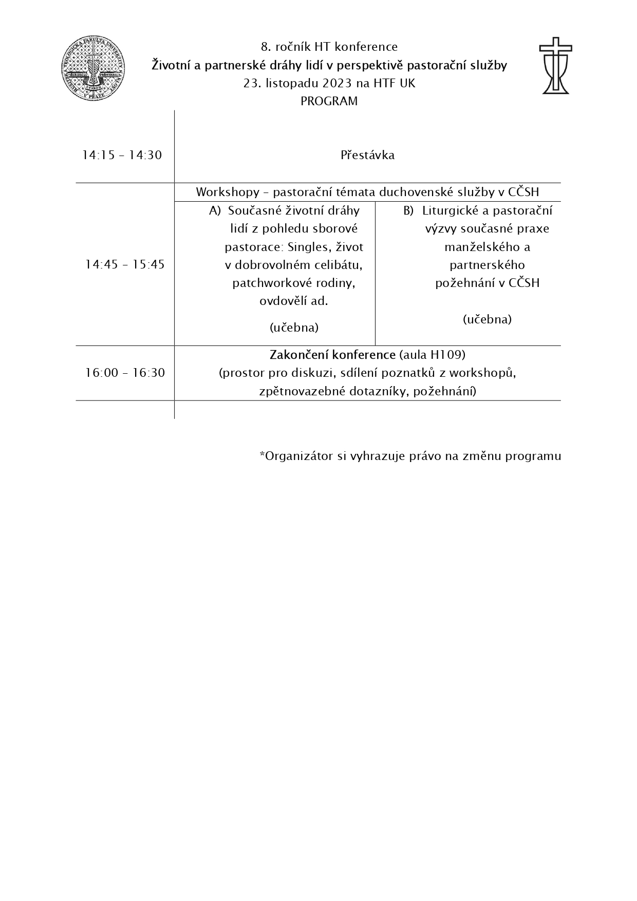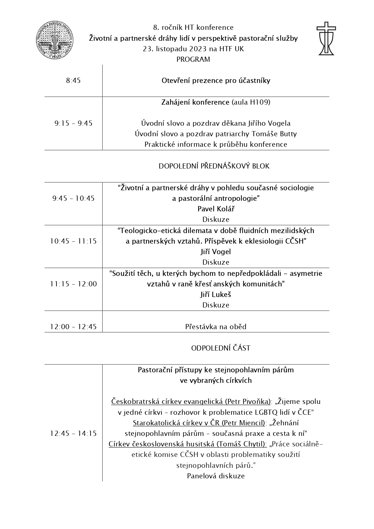 Srdečně vás zveme na další ročník, tentokrát s tématem "Životní a partnerské dráhy lidí v perspektivě pastorační služby" konané ve čtvrtek 23. listopadu 2023 na HTF UK.