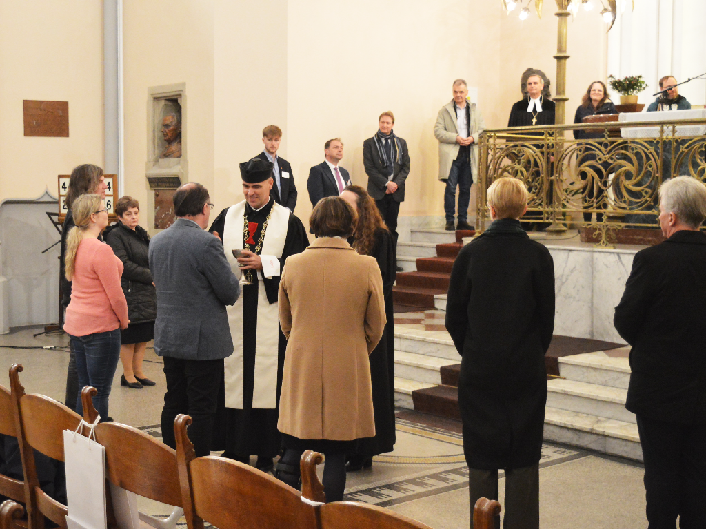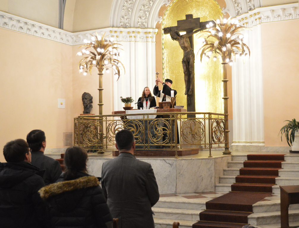 Bohoslužbu vedl pražský biskup David Tonzar a přenostka Odboru pro ekumenu a vnější vztahy Hana Tonzarová.