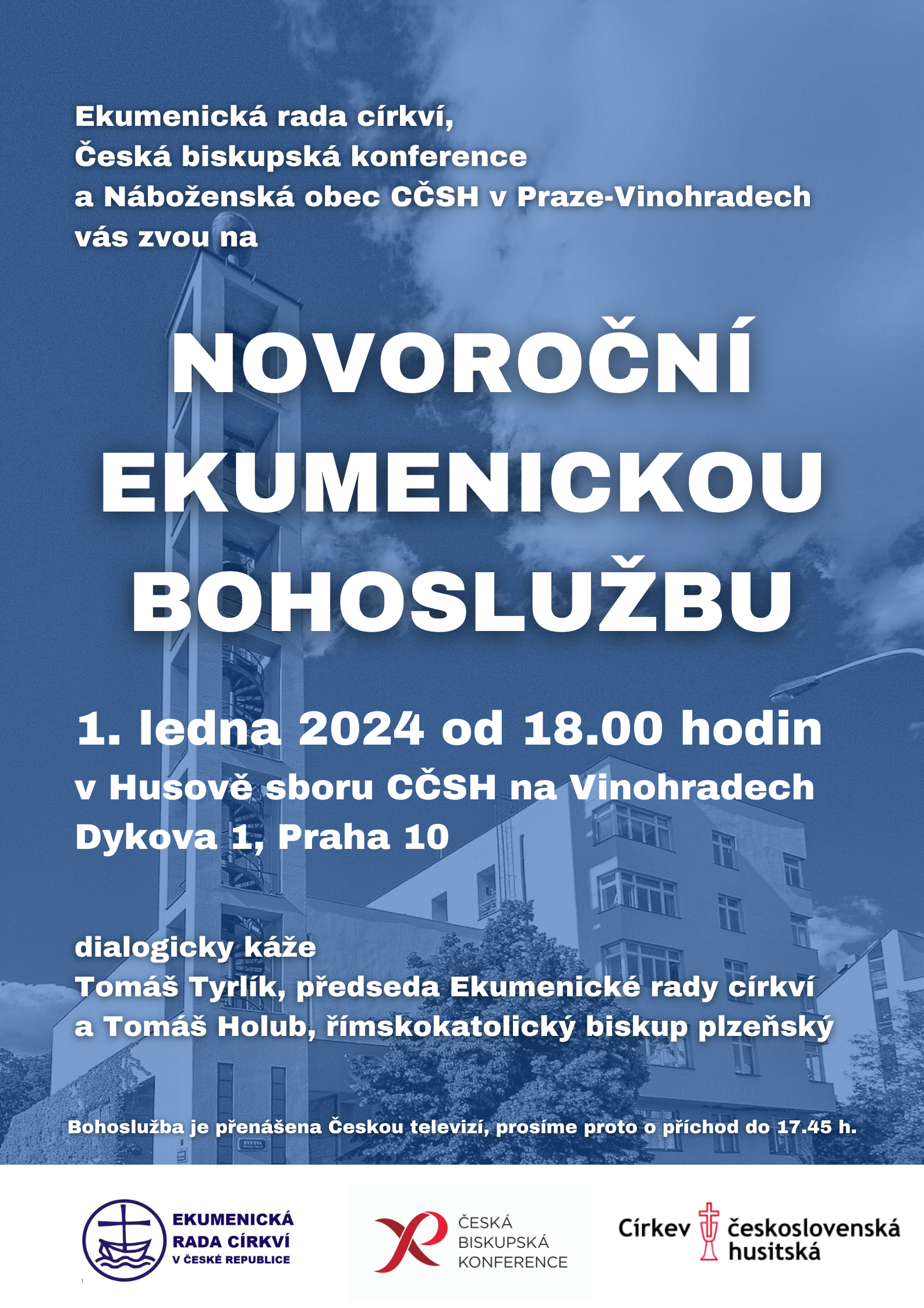 Ekumenická rada církví, Česká biskupská konference a Náboženská obec Církve československé husitské na Vinohradech Vás zvou na Novoroční ekumenickou bohoslužbu, která se bude konat 1. ledna 2024 od 18.00 v Husově sboru CČSH na Vinohradech, Dykova 1, Praha 10.