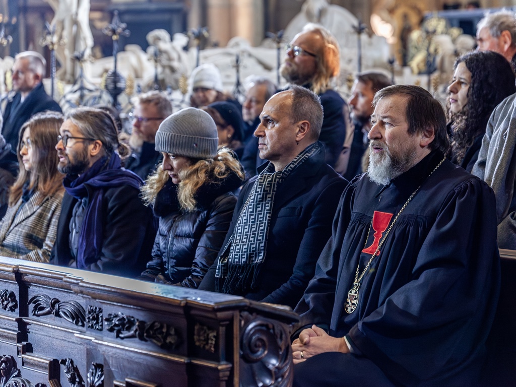 Requiem bylo součástí dne státního smutku vyhlášeného v reakci na čtvrteční tragédii. Společné modlitbě předsedá pražský arcibiskup Jan Graubner. Koncelebrovali apoštolský nuncius v ČR Juda Thaddeus Okolo, kardinál Dominik Duka, pomocný biskup pražský Zdenek Wasserbauer a další kněží. Smuteční bohoslužby se zúčastnili také prezident České republiky Petr Pavel, rektorka Univerzity Karlovy Milena Králíčková, děkanka FF UK Eva Lehečková a další představitelé veřejného života. Za Církev československou husitskou se zúčastnil patriarcha Tomáš Butta.
