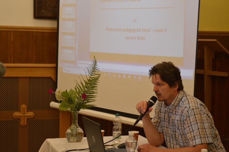 Hlavní přednášku s názvem „Pohledy na současnou diskusi o vzdělání“ přednesl prof. Tomáš Kasper. Seznámil nás s historií vývoje moderního školství a jeho reforem. Připomenul důležitost aktivního učení, badatelského přístupu při objevování, učení v přírodě, individuálního přístupu i práce v malých skupinách. Zmínil také novinky, např. digitální vzdělávání a využití umělé inteligence jako zdroje informací. Porovnával české školní prostředí s blízkými evropskými sousedy a zdůraznil, že u nás stále přetrvává ostré dělení škol na tradiční a alternativní a církevní; zmínil se také o přílišné orientaci na rozumové učení a výkon žáka. V zahraničí je běžné zapojení moderní např. montessori pedagogiky a péče o duchovní rozvoj dětí či výuky náboženství ve většině základních škol. Za prospěšné považuje dr. Kasper přirozené propojování spíše než oddělování a vytváření umělých hranic.