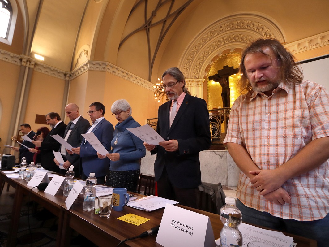 Po bohoslužbě shromáždění pozdravila jménem ERC v ČR ses. Ivana Procházková, superintendentka Evangelické církve metodistické a první místopředsedkyně ERC, která naší církvi popřála statečnost, moudrost a naději. Br. patriarcha poté předal ocenění za dlouholetou duchovenskou službu br. faráři Františku Konvalinkovi, ses. em. biskupce Janě Šilerové a br. faráři a výtvarníkovi Lumíru Čmerdovi in memoriam, za nějž ocenění převzala jeho manželka ses. Irena Čmerdová. Bratřím biskupům Pechancovi, Dovalovi a Tonzarovi předal pamětní medaile k 600. výročí Jana Žižky z Trocnova.