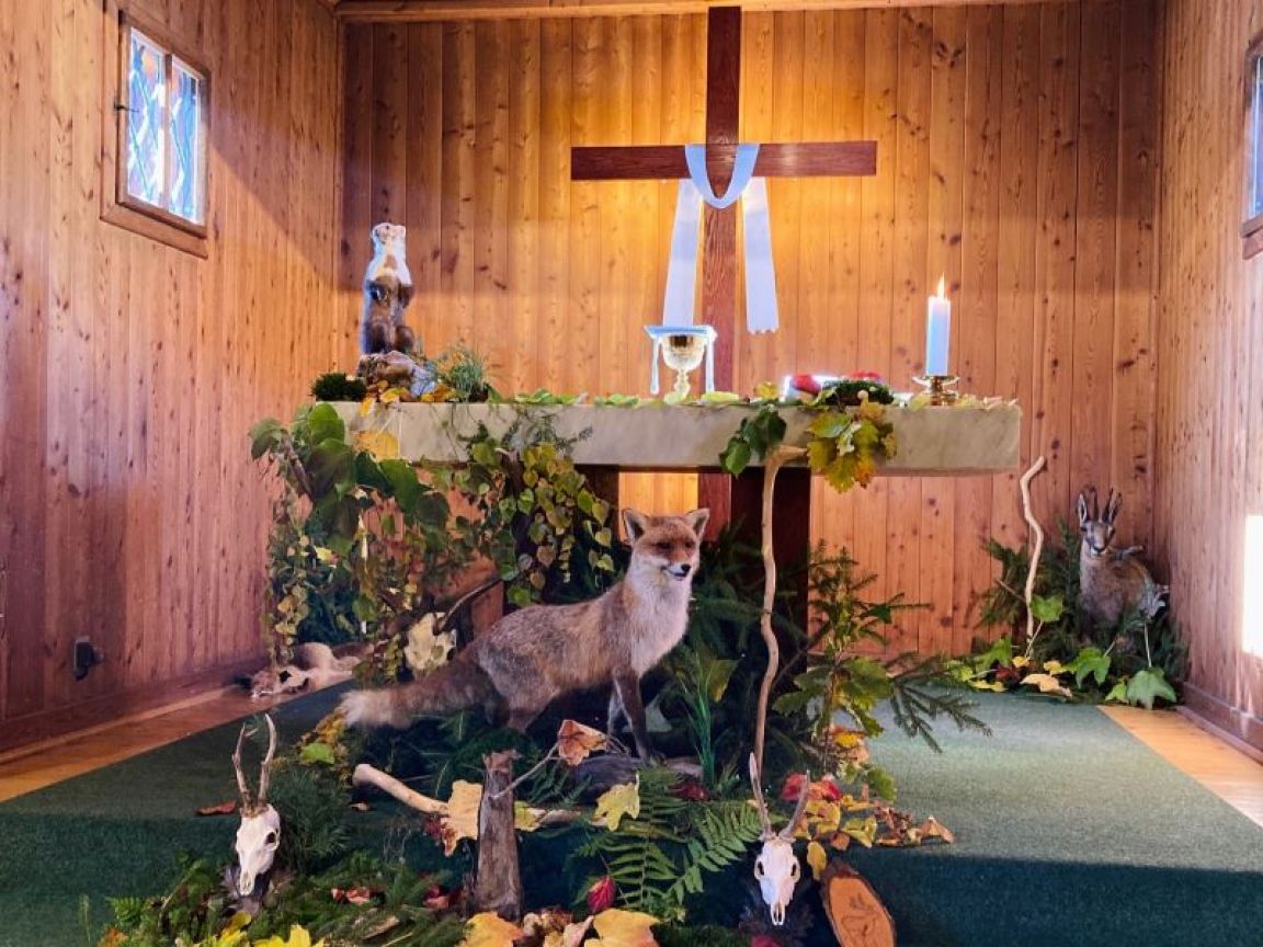 Po pátečních bohoslužbách 10. 11. 2023 v pátek Hanka a Peťa přivezli své vypreparované úlovky. V sobotu Olinka se Zuzkou ke zvířatům vytvořili pěknou podzimní výzdobu.