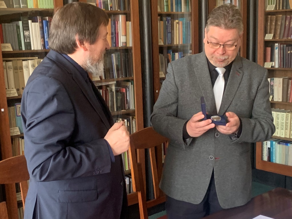Patriarcha Tomáš Butta předal řediteli Husitského muzea Jakubu Smrčkovi pamětní medaili Jana Žižky.