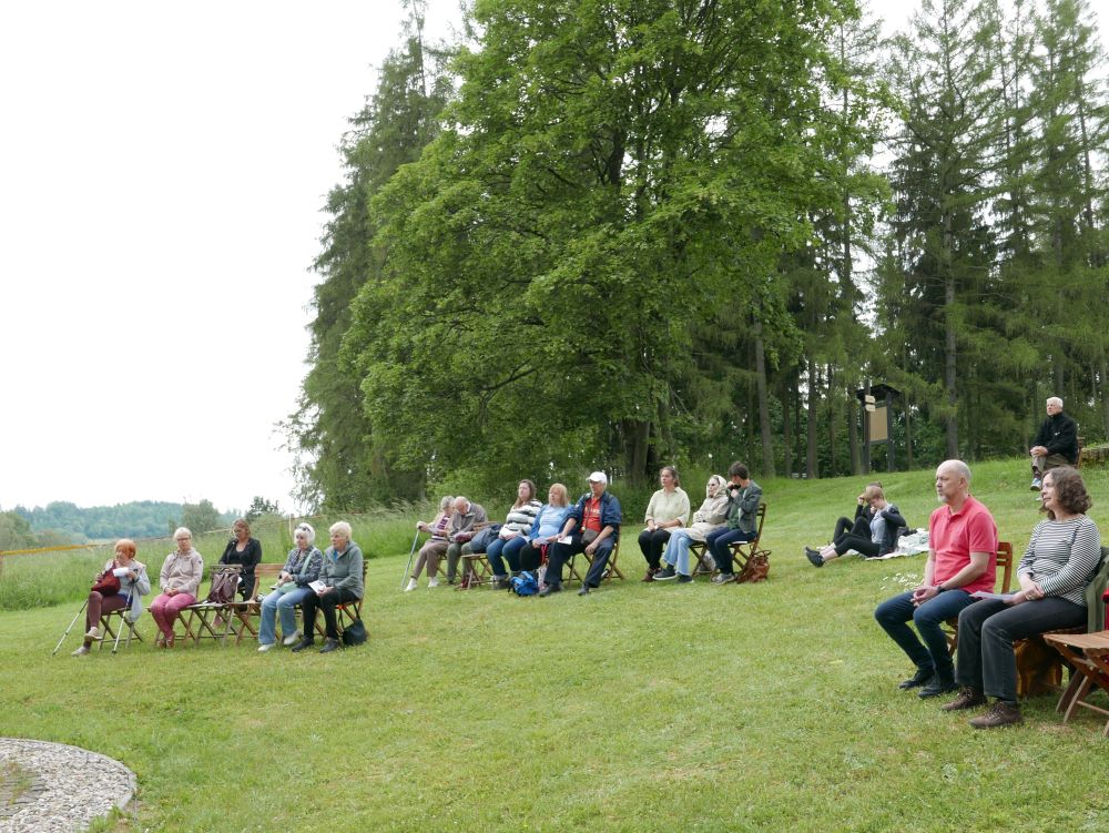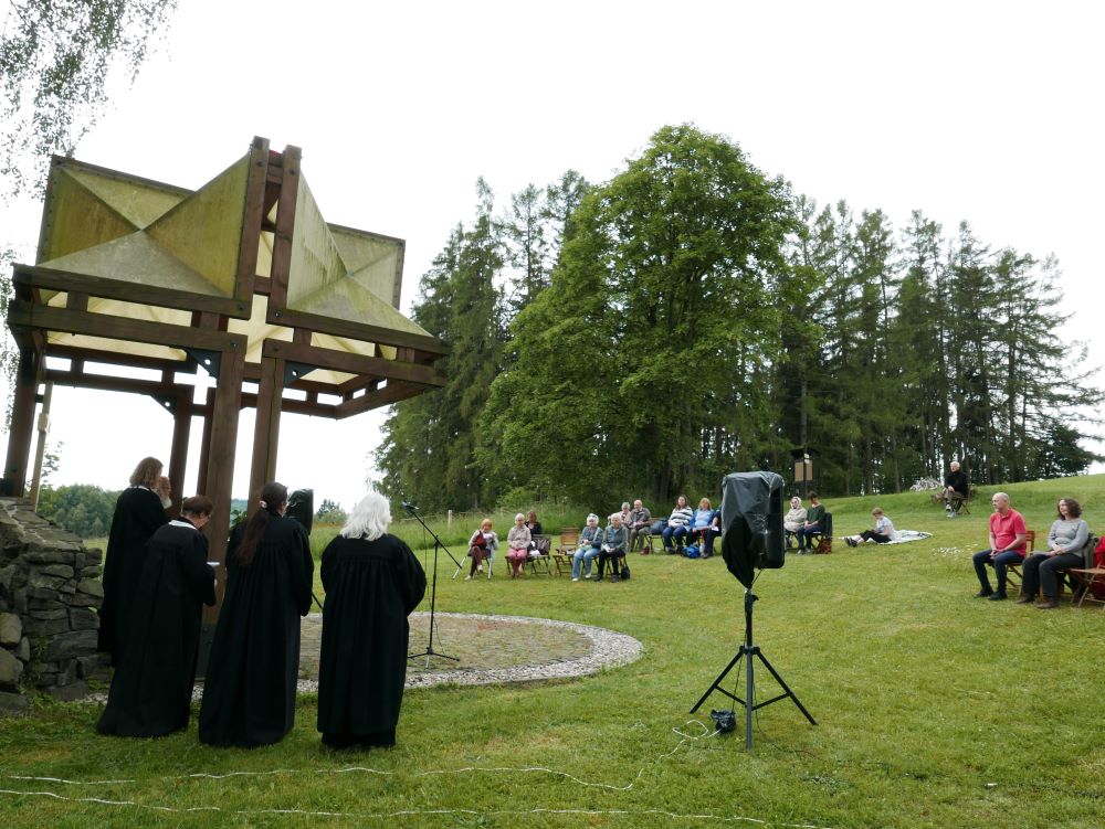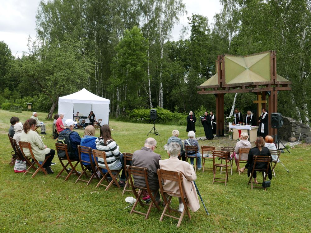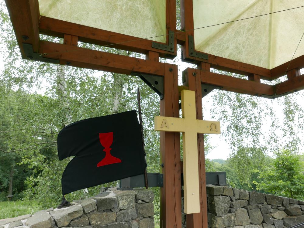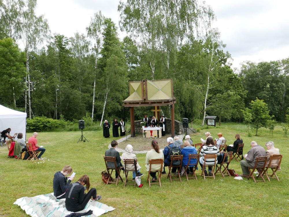 Tato a další slova, písně a modlitby, pak zazněla kromě nedávno postavené moderní kaple s motivem kříže také na místě Farského rodné chalupy a u sloupu s reliéfem patriarchy, které jsou součástí přírodního areálu.