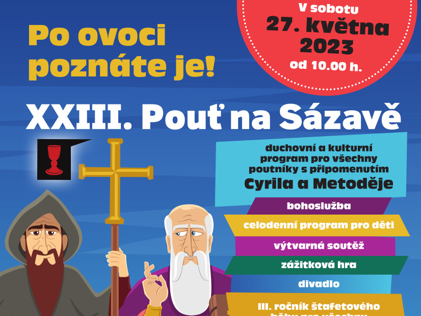 Již po XXIII. se sejdeme na Pouti na Sázavě v městečku Sázava pod Sázavským klášterem, a to již poslední květnovou sobotu - 27. 5. 2023! Je to nejbližší termín, kdy si připomínají naši východní bratři a sestry příchod našich věrozvěstů Cyrila a Metoděje, jejichž 1160. si letos na Sázavě připomeneme.