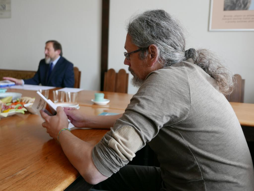 Fotografie z prezentace nové knížky současného patriarchy bratra Tomáše Butty "Modlitby v čase a na rozmanitých místech". Modlitby zazněly při bohoslužbách či v různých příležitostech v letech 2019-2023, jsou připomenutím těchto událostí, ale mohou být i pomůckou k vlastním modlitbám v různých situacích církve. Knihu vydala Církev československá husitská v edici Blahoslav, 2023.