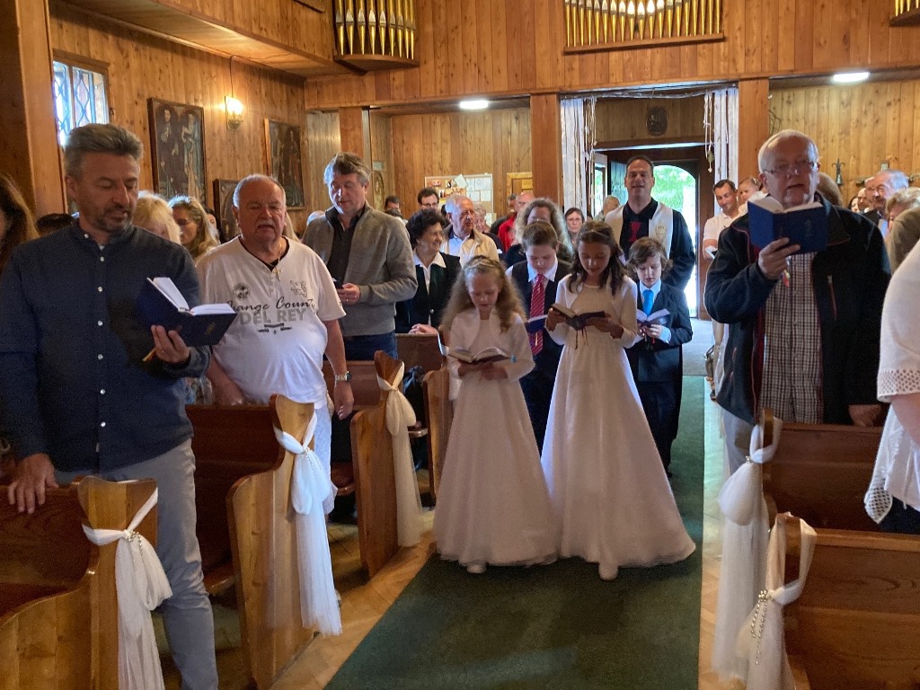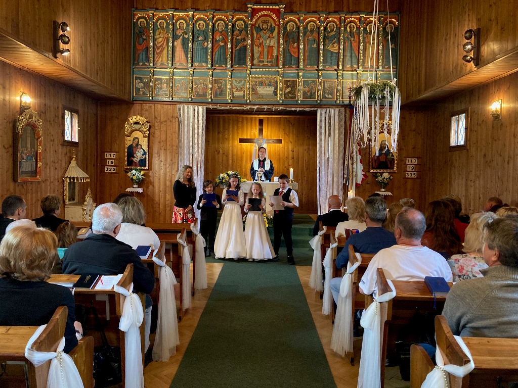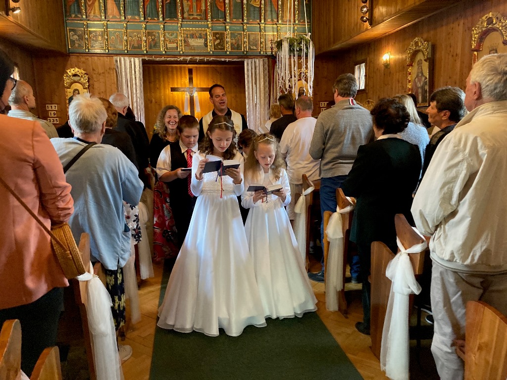 Probudili jsme se do pěkného svátečního rána. Děti se sešly na faře. Jakmile zvony z věže našeho kostela odzvonily devátou hodinu, začaly slavností bohoslužby. Děti šly společně s bratrem farářem Martinem a sestrou kazatelkou Martinou, která vedla přípravu dětí během roku, průvodem do kostela.