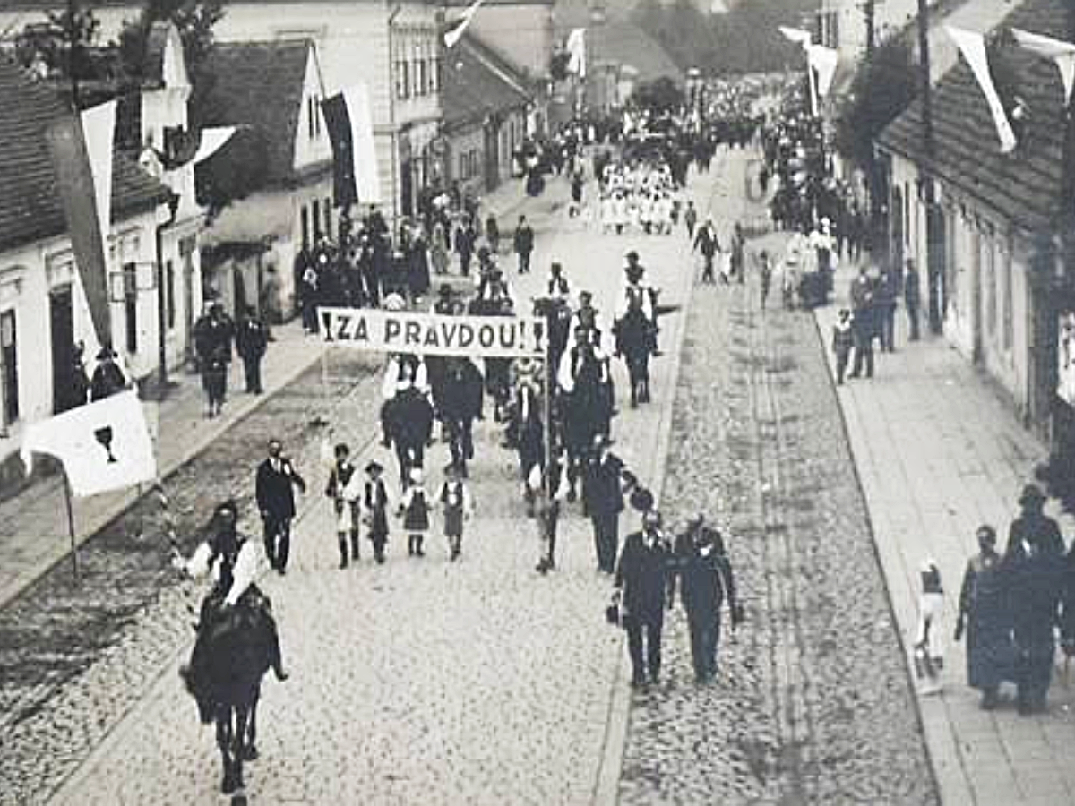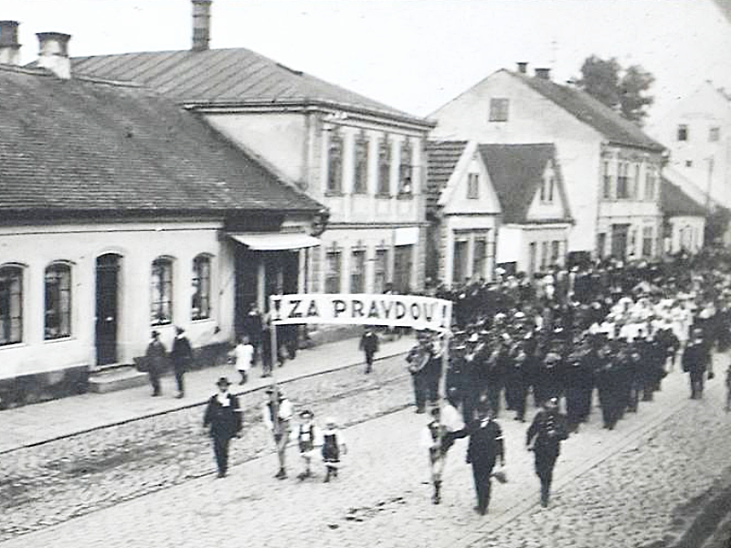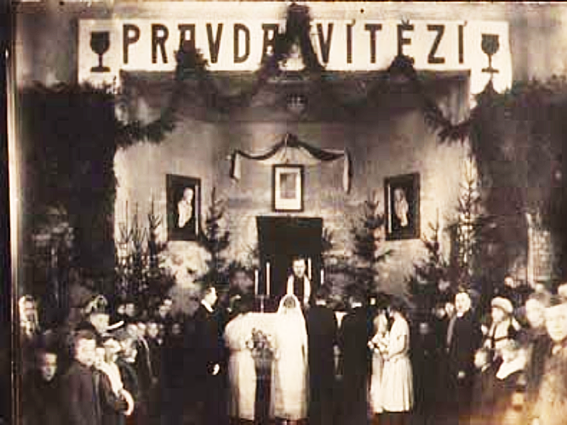 Fotografie patří 88leté pamětnici sestře Sukové. Na jedné z nich je nad oltářem nápis „Pravda vítězí“. Fotografie je z prvních bohoslužeb, kdy se heslo uskutečnilo, když se před sto lety 22. června roku 1924 konalo slavnostní otevření zdejšího sboru CČS.