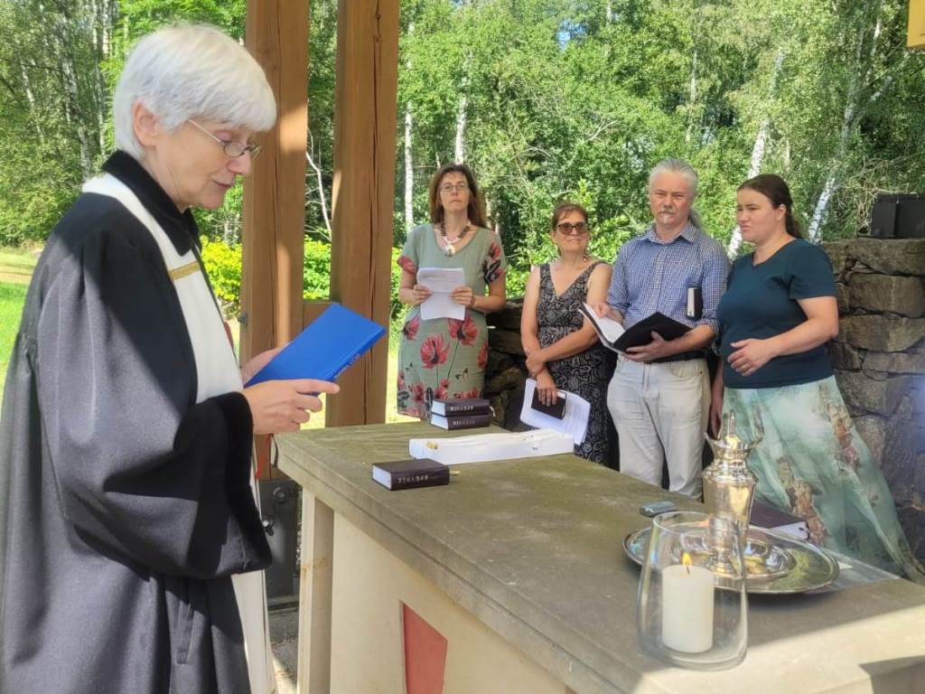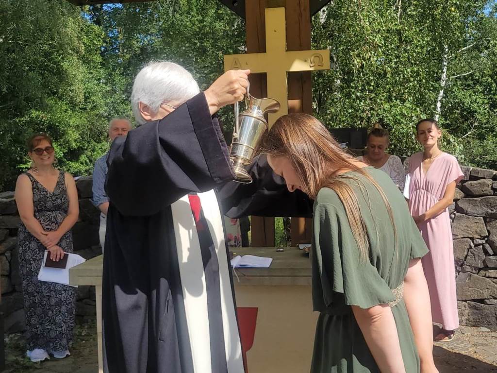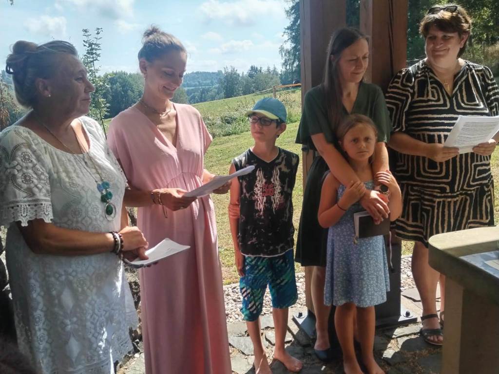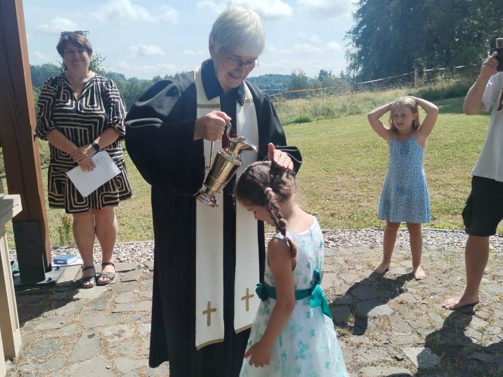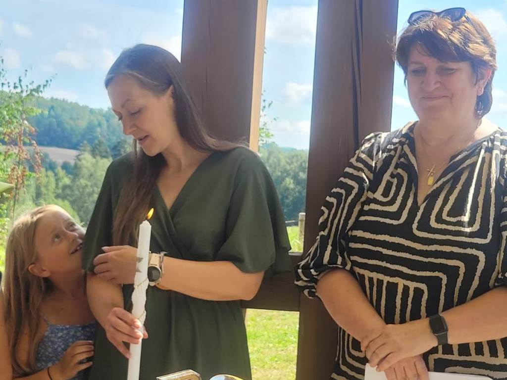 Tento radostný a požehnaný den nastal ve čtvrtek 15. srpna. Sjelo se nás do Škodějova zhruba dvacet, dospělých i dětí, abychom společně přijali do rodiny církve naše sestry Terezu Cecílii Jiránkovou, Evu Johanu Buchingerovou a malou Veroniku Cecílii Vlkovou. Byl to prostý, krásný obřad, prostoupený zpěvem, při němž nás pozorovali vedle se pasoucí koně a všichni, věřím, jsme cítili, že je s námi i Duch svatý. Zbyl samozřejmě i čas na procházku po okolí a opečení špekáčků na ohýnku.