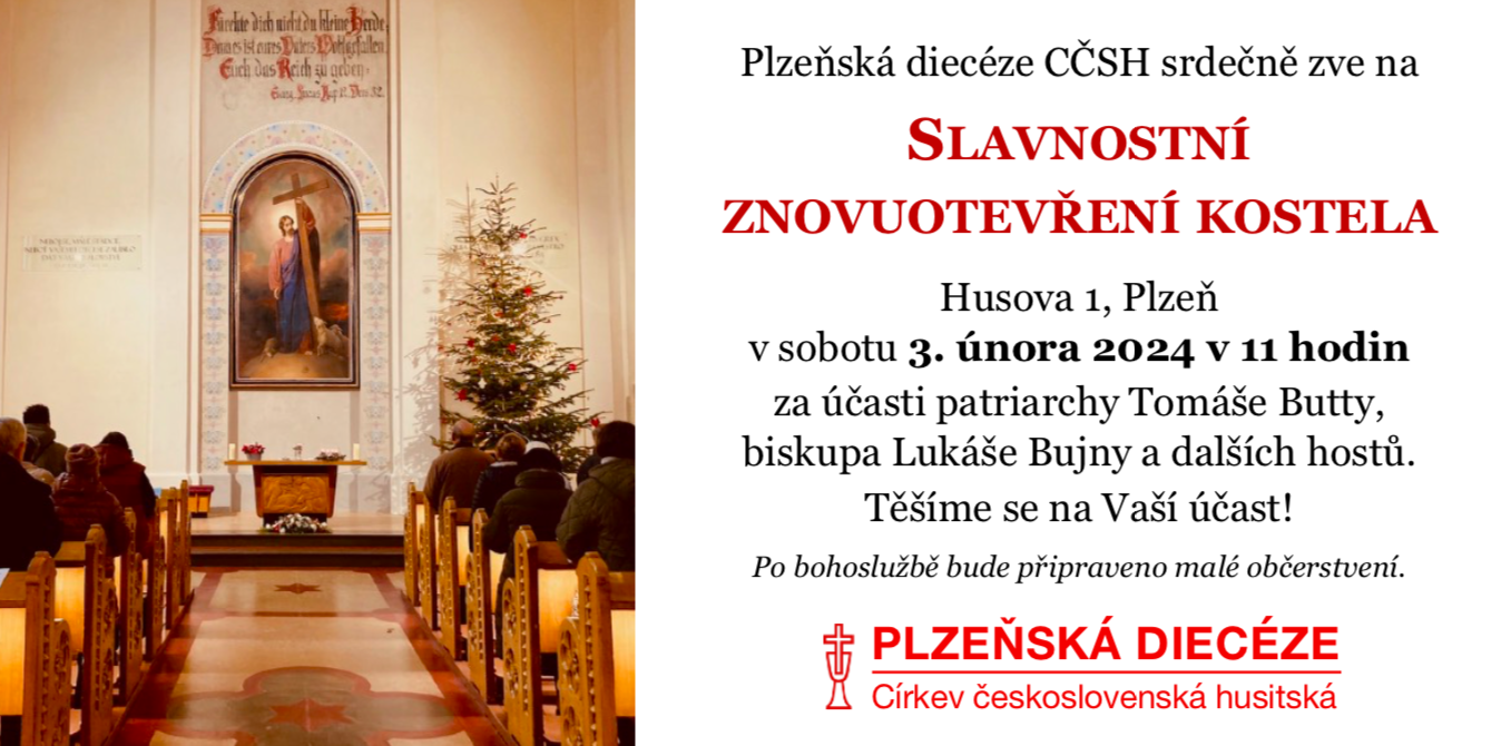 Dne 3. února 2024 od 11.00 hodin srdečně zveme na slavnostní znovuotevření kostela v Plzni v Husově ulici 1 (dříve Sbor Karla Farského).