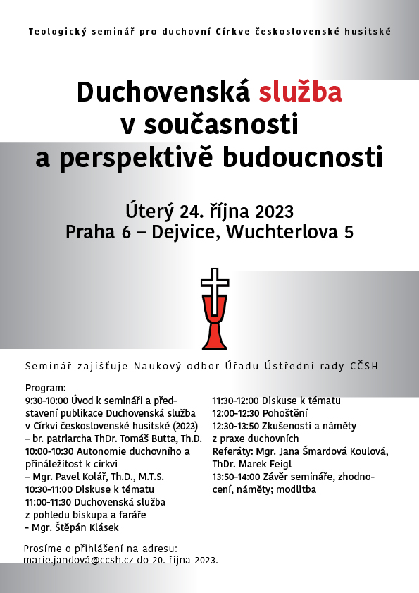 Teologický seminář pro duchovní Církve československé husitské Duchovenská služba v současnosti a perspektivě budoucnosti se bude konat v úterý 24. října 2023.